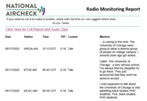 Thanks to our proprietary system, you can receive accurate and easy-to-read text with any report (no gibberish to try to decipher). You can also choose to include an audio summary that allows you to “click and play” 15 seconds of audio around your keyword(s) mention…or you may prefer to receive the full clip with all audio around your mention. Metrics (audience #’s and media values) are also an option.